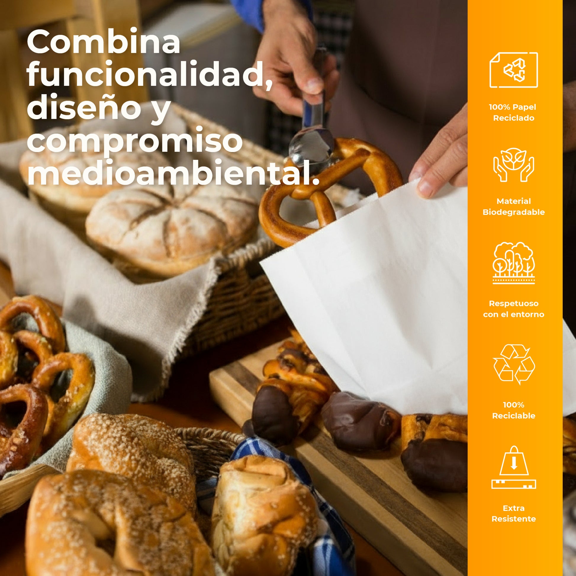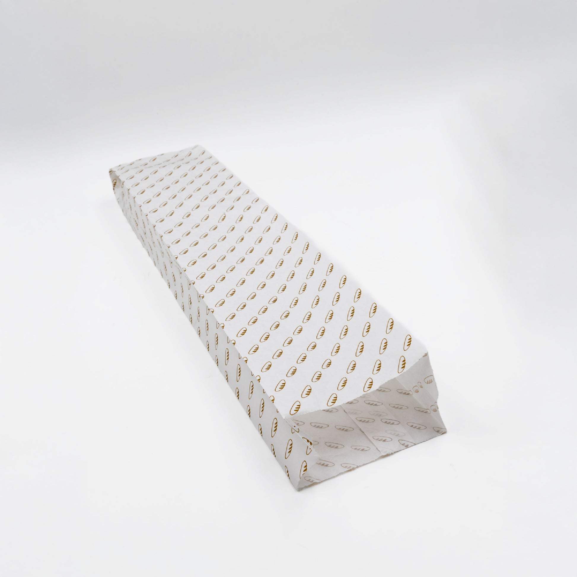 The 35 g/m² white kraft paper offers a lightweight and recyclable solution for food packaging. It's certified for direct contact with baked goods and maintains its shape thanks to its V-shaped bottom. Its discreet bread print design provides a distinctive visual touch without compromising its neutral and functional aesthetic.