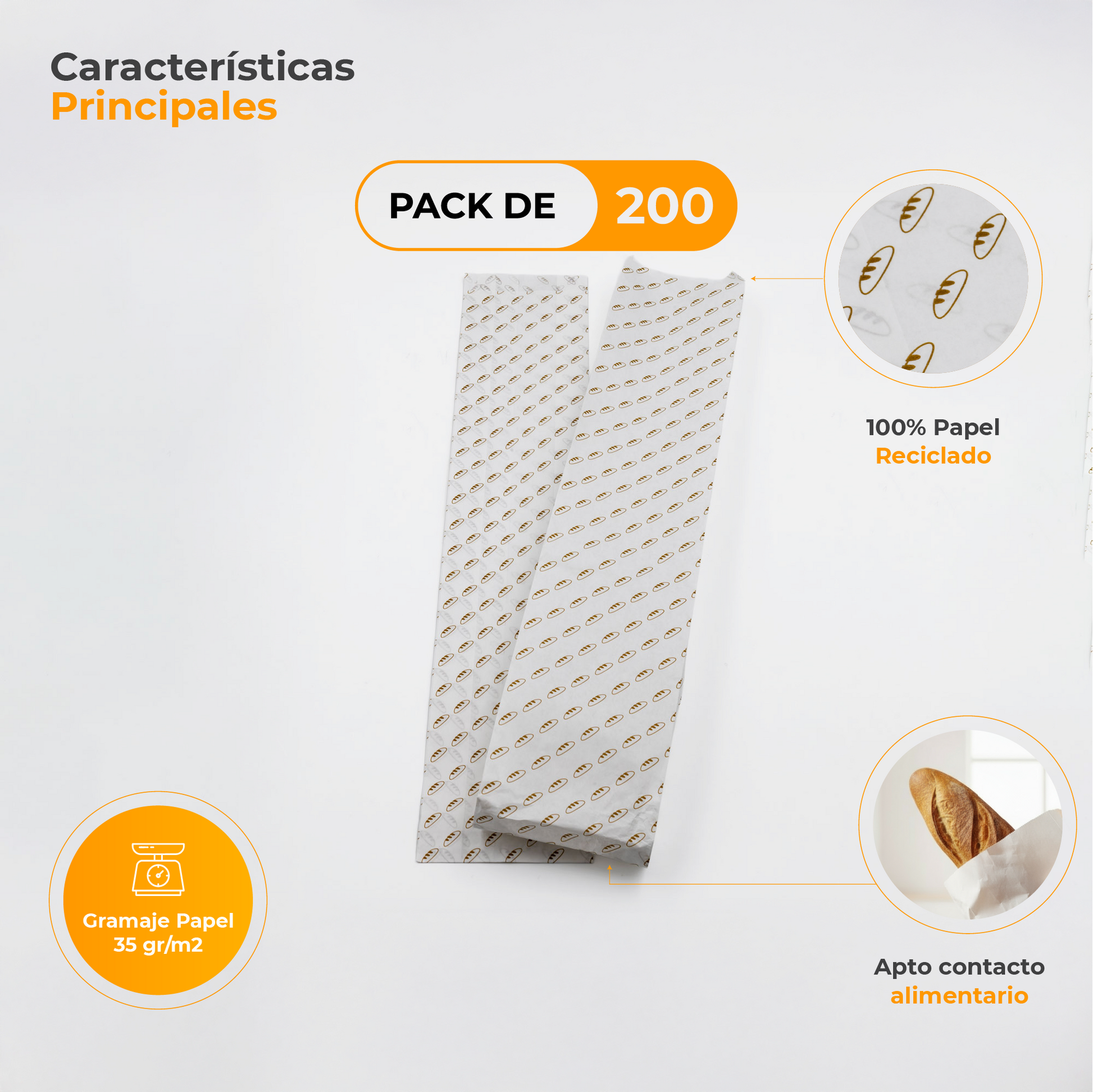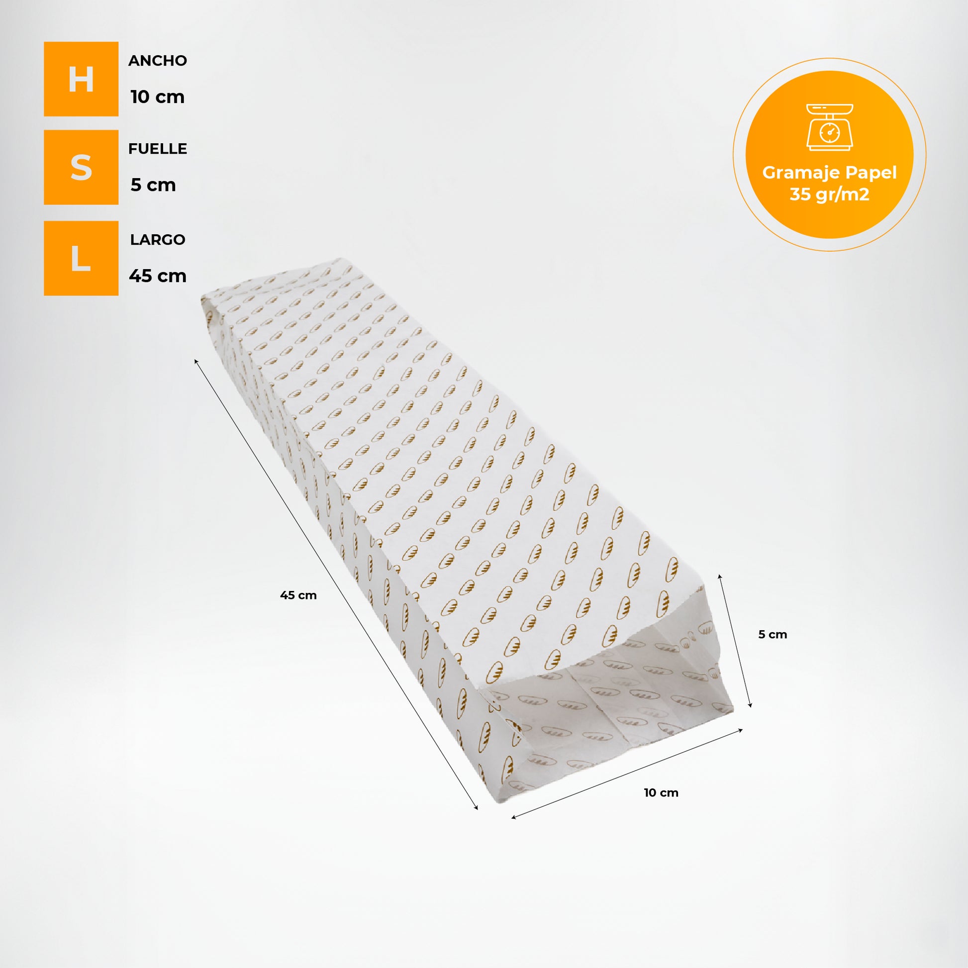 Pack of 200 White Kraft Paper Bags 35gr/m2 with V-shaped bottom – 10x5x45 cm with Bread Print