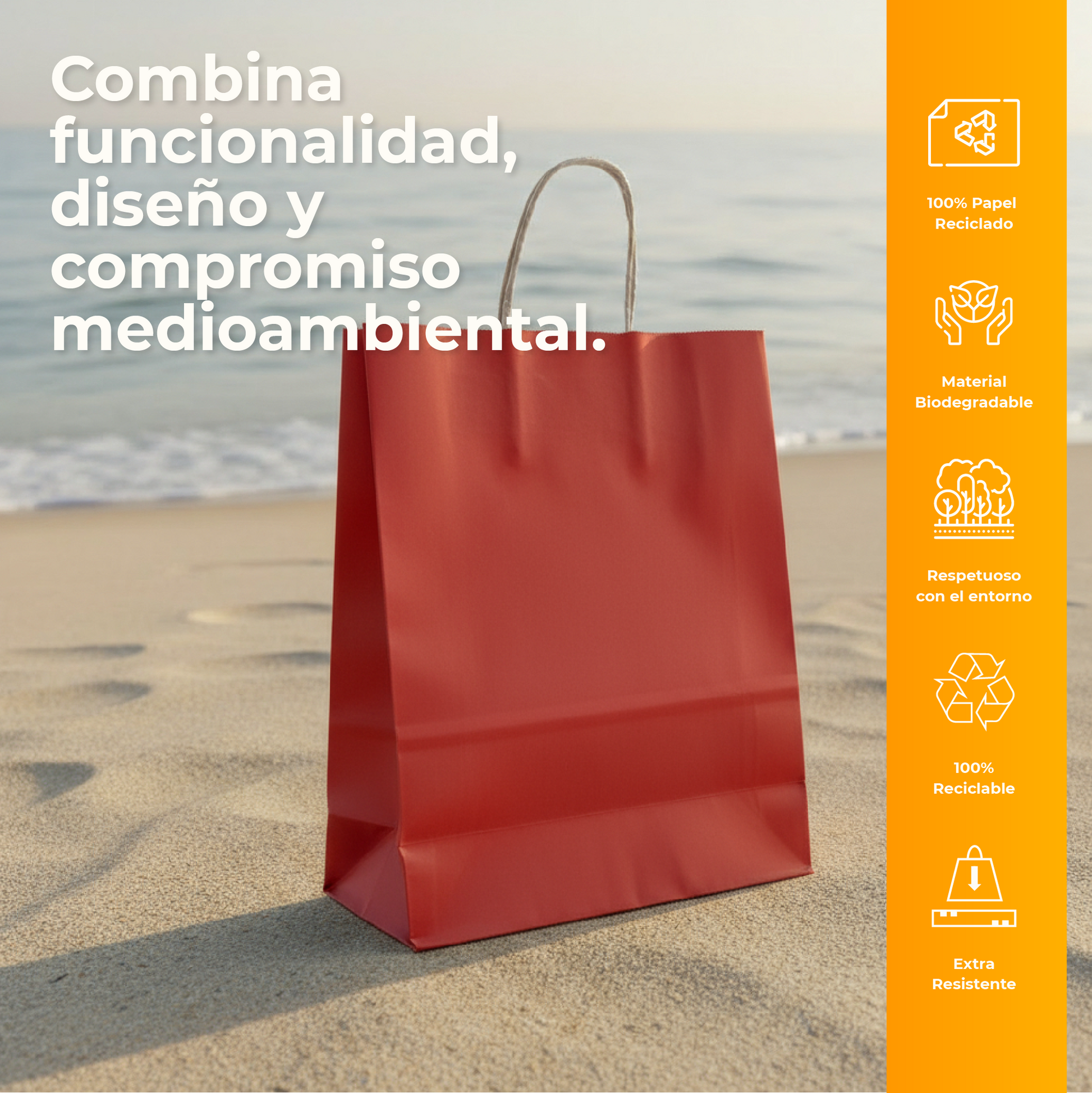 Made from 80 g/m² kraft paper dyed red on the outside and white on the inside, these bags offer a balance between design and sustainability. They are recycled, recyclable, and biodegradable. The braided handles reinforce their functionality, ensuring a firm and comfortable hold for a variety of items.