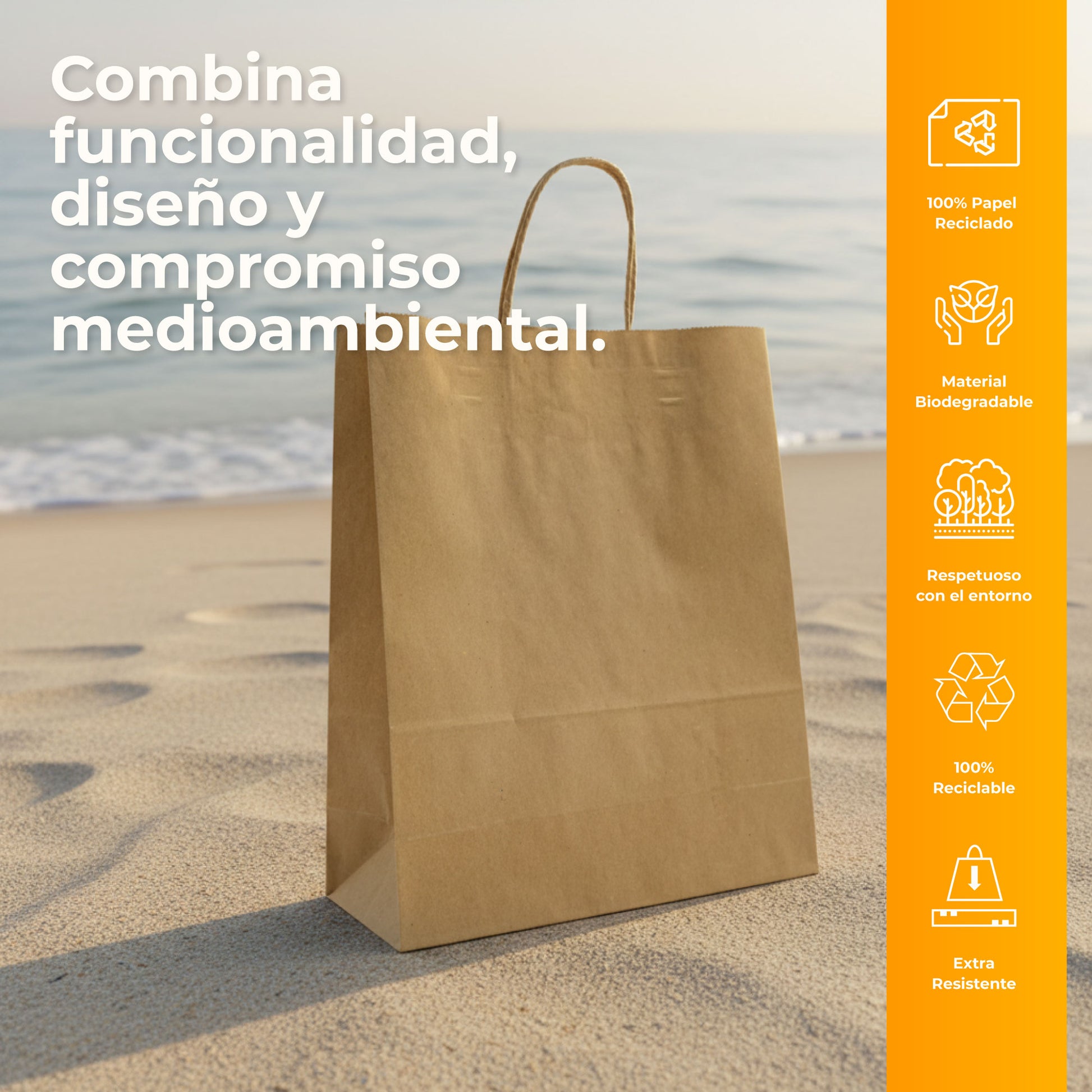 These bags are made from 80 g/m² brown kraft paper, 100% recycled and certified. The material is durable, biodegradable, and recyclable, ensuring a sturdy structure ideal for products such as bread, lightweight clothing, pharmacy products, books, cosmetics, and more. The braided handles offer added comfort and support for carrying bulky items.